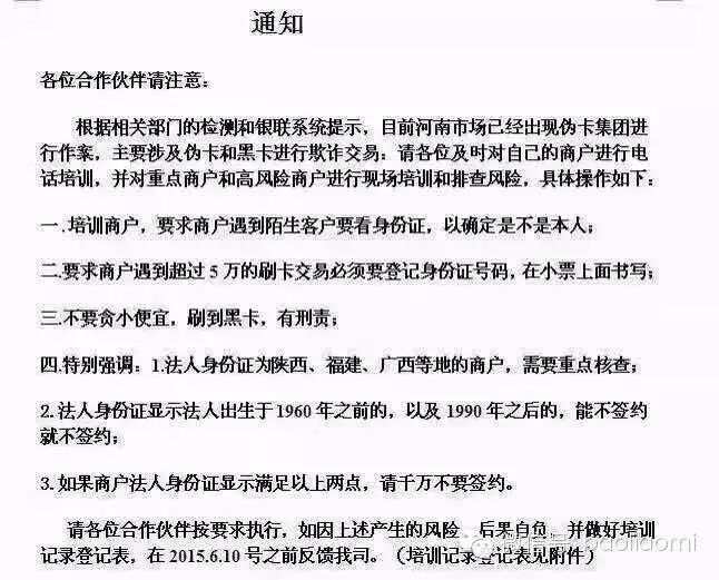 [size=15.5555562973022px]在POS行业,一个假商户或者遭遇一次盗刷,代理商就会面临上万损失,甚至破产…… 据POS代理商反馈,近期拒付呈现一定的上升趋势……之前曝光了专门诈骗的团伙,通过拒付方式进行欺诈!对此,请大家务必高度重视,严格警惕!多家支付公司已经发出紧急通知! 紧急通知:各商户、代理商:请注意这几个人: 陈启活 440106XXX10034737